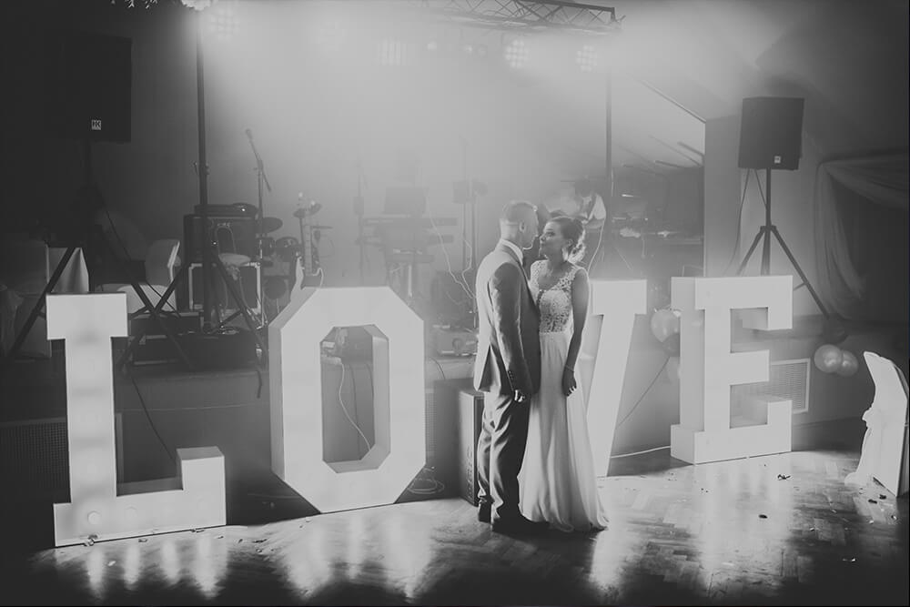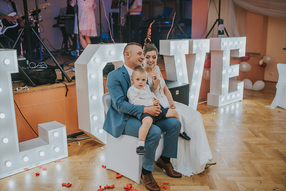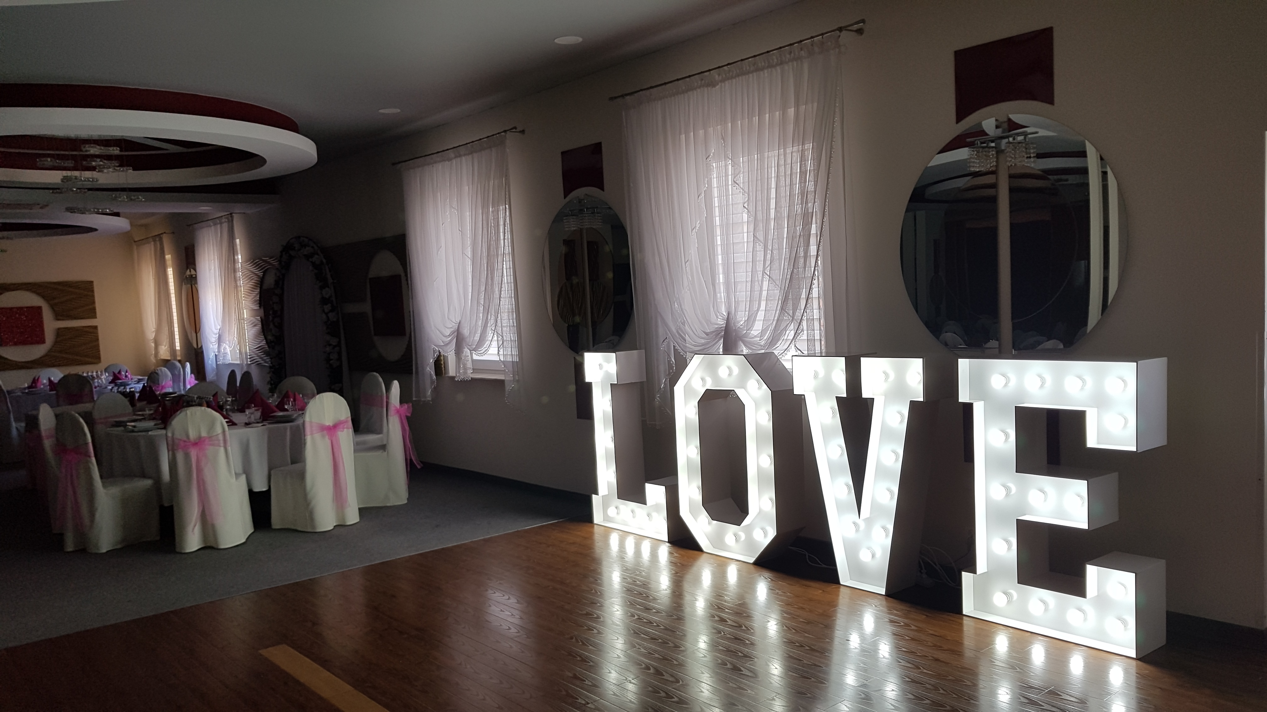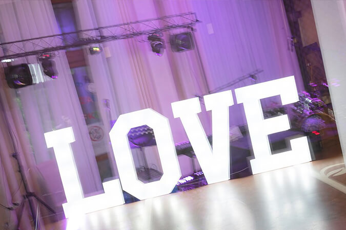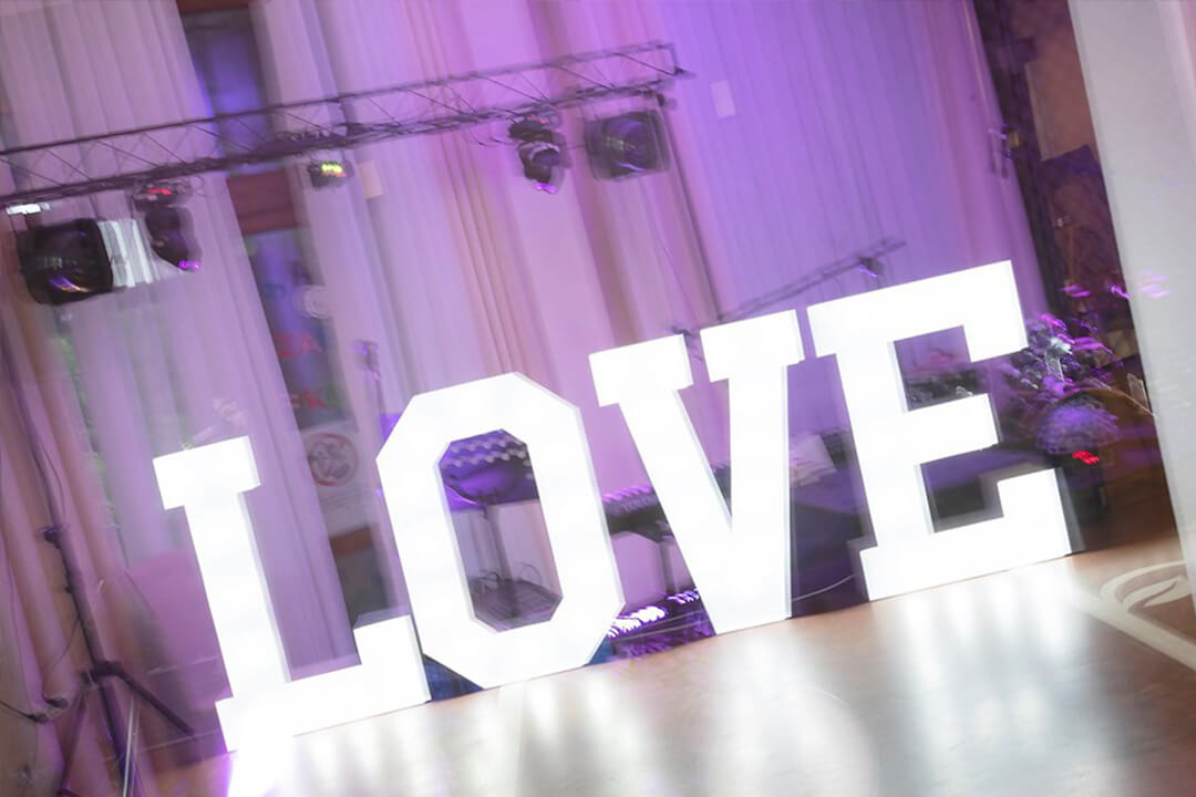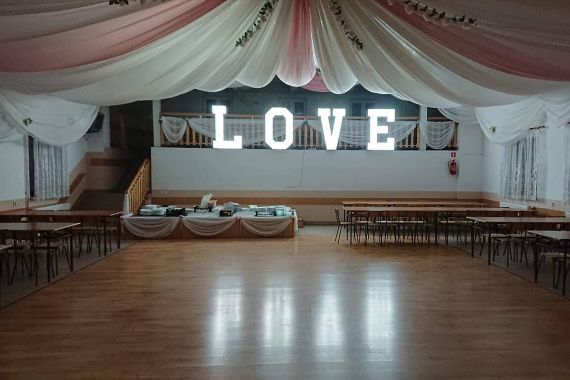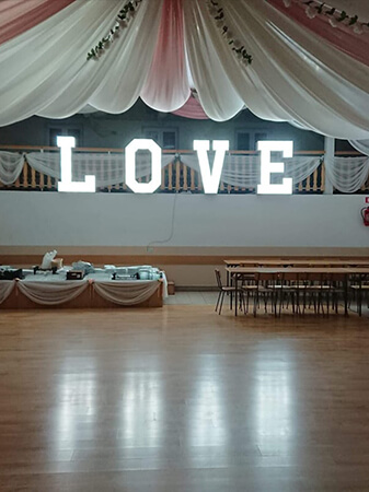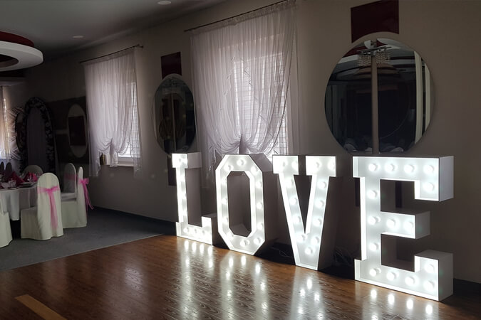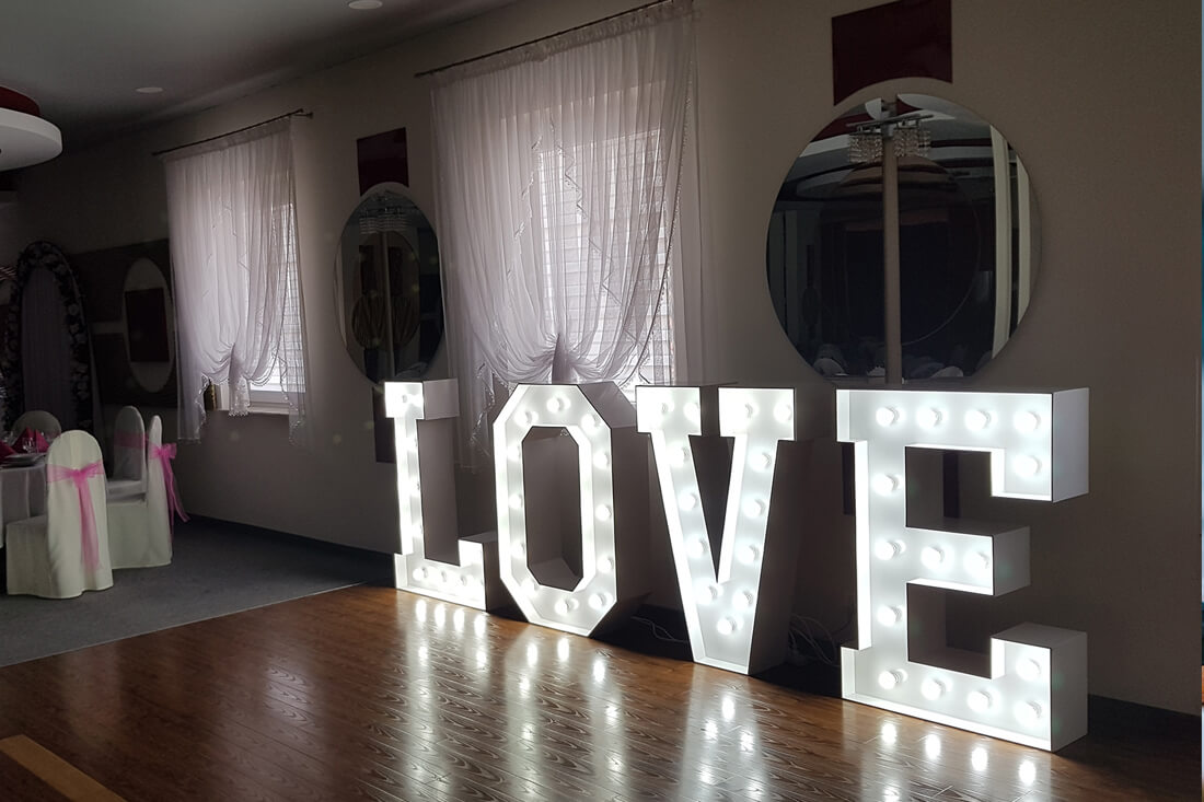 | Piękny napis w kolorze białym o wysokości 120 cm i szerokości 400 cm po rozstawieniu, podświetlony żarówkami LED. |